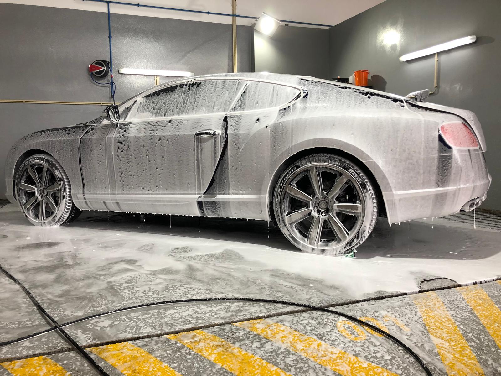 A nossa etapa profissional de pré-lavagem usa espuma de neve espessa para levantar com segurança sujidade e contaminantes da pintura antes de qualquer lavagem de contacto começar. Esta primeira etapa sem toque é essencial para proteger acabamentos delicados em veículos de luxo como este Bentley.