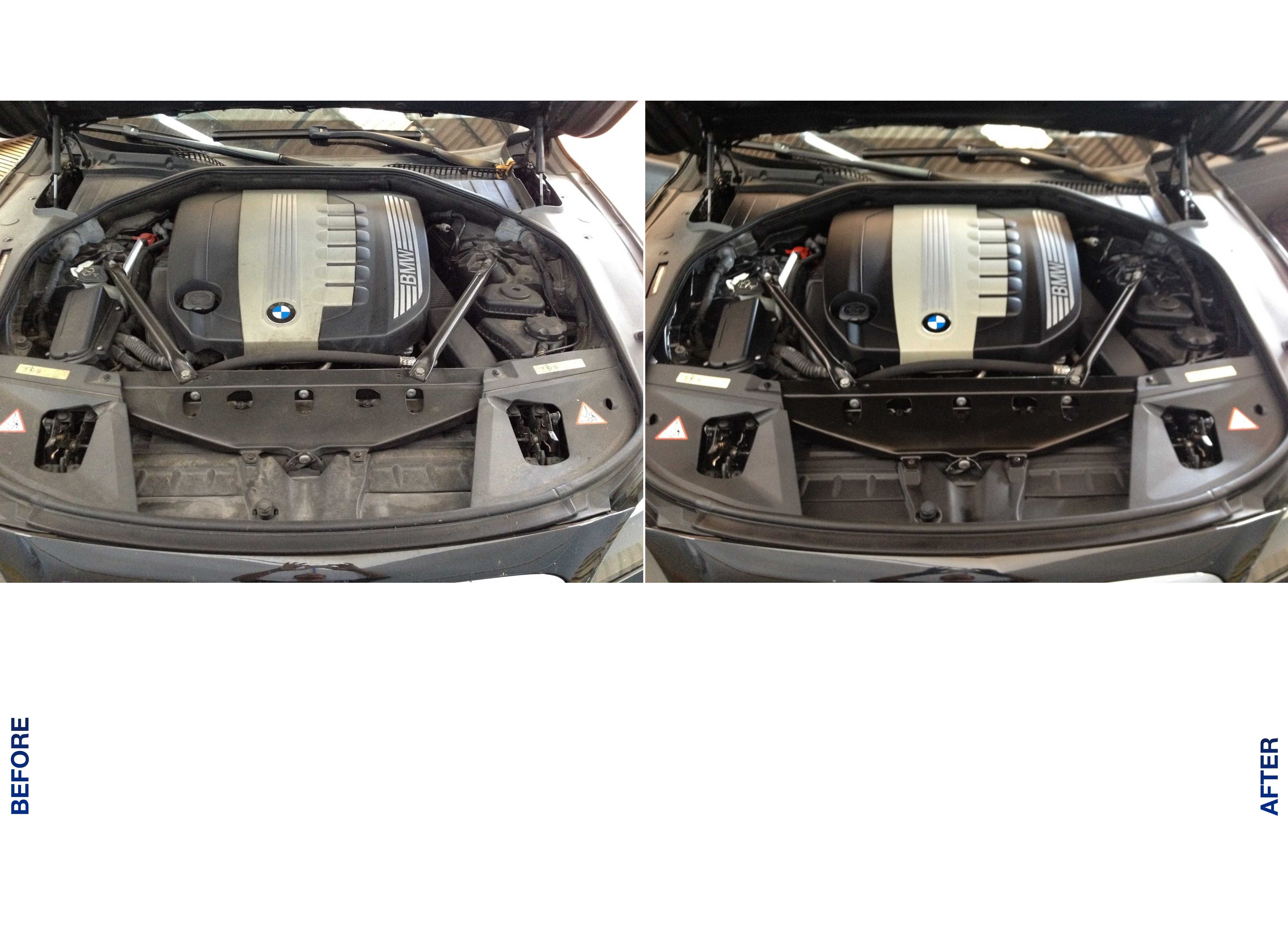 Limpeza a vapor do compartimento do motor transforma o compartimento do motor deste BMW de sujo para condição de showroom. Limpeza segura e eficaz sem risco de danos de água a componentes elétricos.