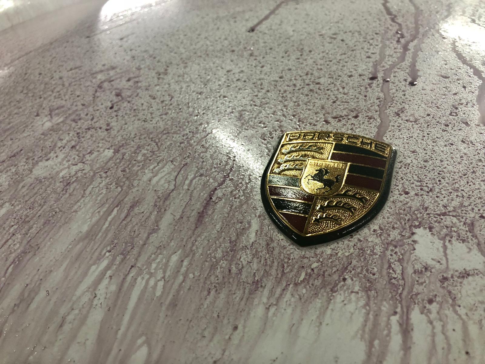 Rodas Porsche fortemente contaminadas transformadas através do nosso processo de limpeza profunda de rodas. Pó de travão, alcatrão e sujidade da estrada completamente removidos revelando o acabamento prateado original. Pinças PCCB amarelas agora visíveis e imaculadas.