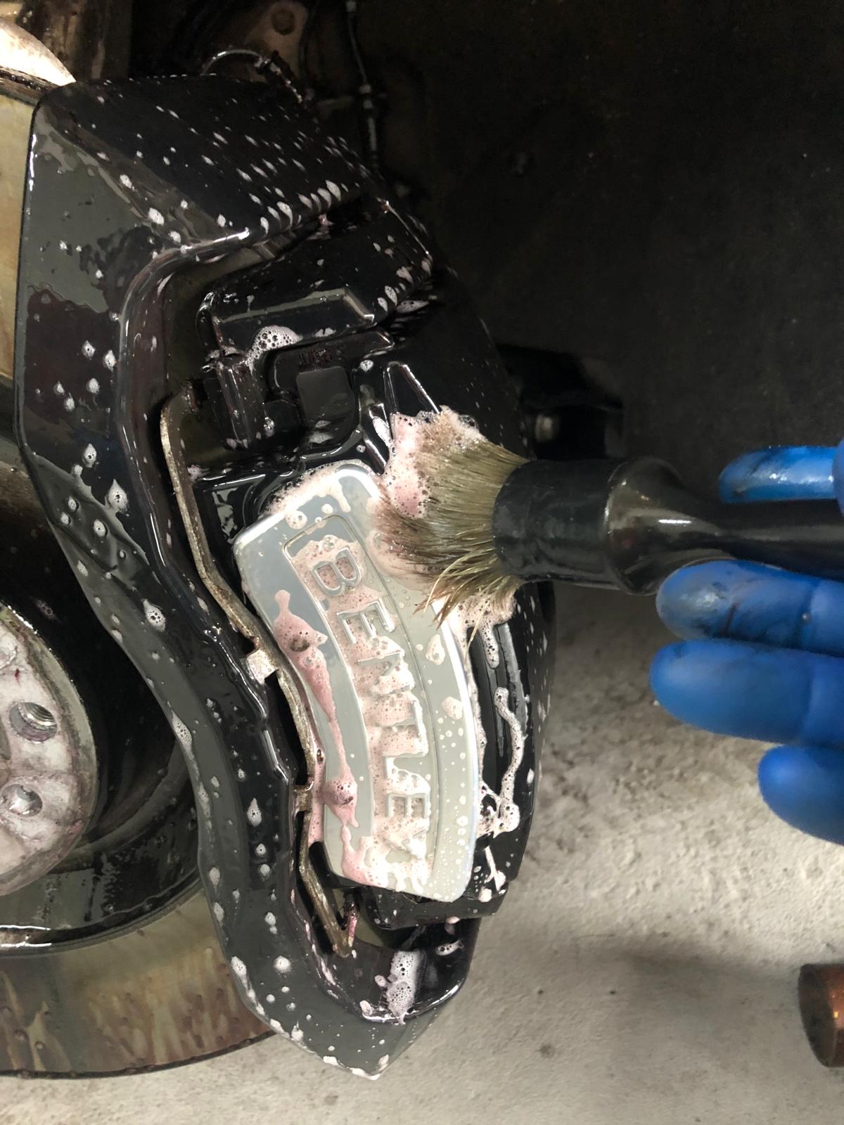 Detalhamento manual de pinças de travão Bentley com escovas especializadas. Limpamos cada detalhe incluindo as áreas que a maioria dos detalhadores ignora - porque a perfeição está nos detalhes.