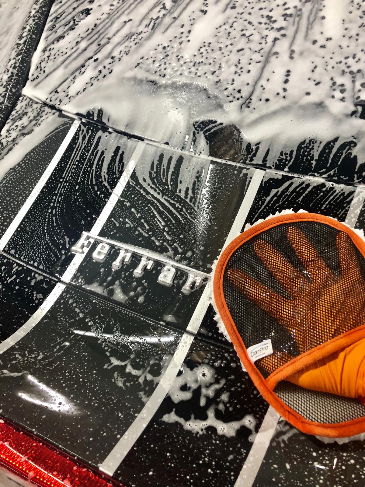 Luva de lavagem de microfibra premium CarPro usada para lavagem de contacto segura neste Ferrari. Apenas as melhores ferramentas tocam estes acabamentos exóticos.
