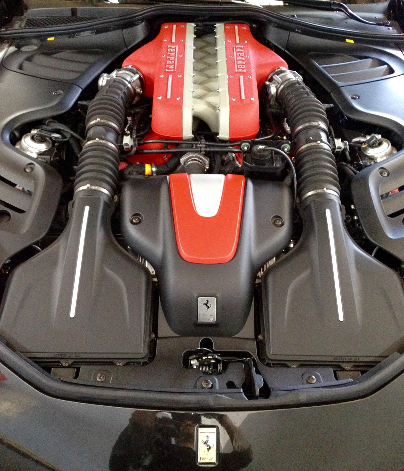 Após limpeza a vapor - o compartimento do motor deste Ferrari FF V12 está pronto para exposição. Cada componente limpo e acabado à perfeição, digno de qualquer exposição concours.